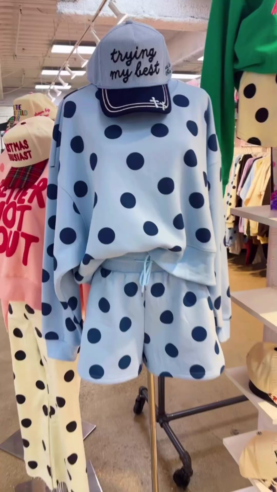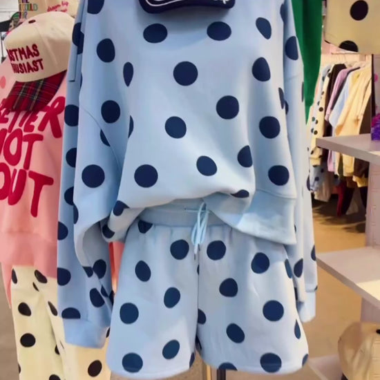 Blue set is sold with sweatshirt and shorts. True to size. Slight oversized fit.