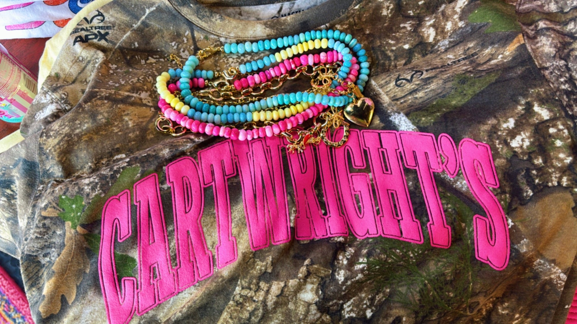 BEST SELLER ALERT!!!! This is a unisex real tree camo tee with Cartwright’s puff letters! These come in hot pink or royal blue with camo! So cute to throw on with your fav jeans or make it fun with a colorful bottom and Jewlz!