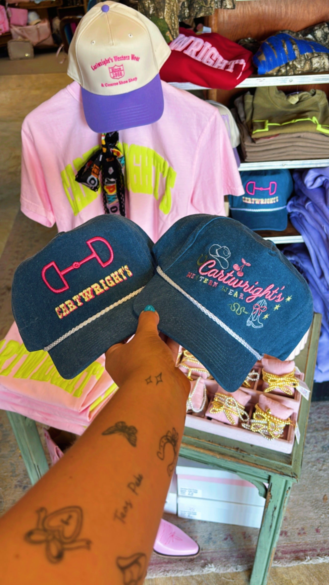 This hat is the denim rope trucker hat with Cartwright’s embroidered in butter yellow and a horse bit in hot pink!