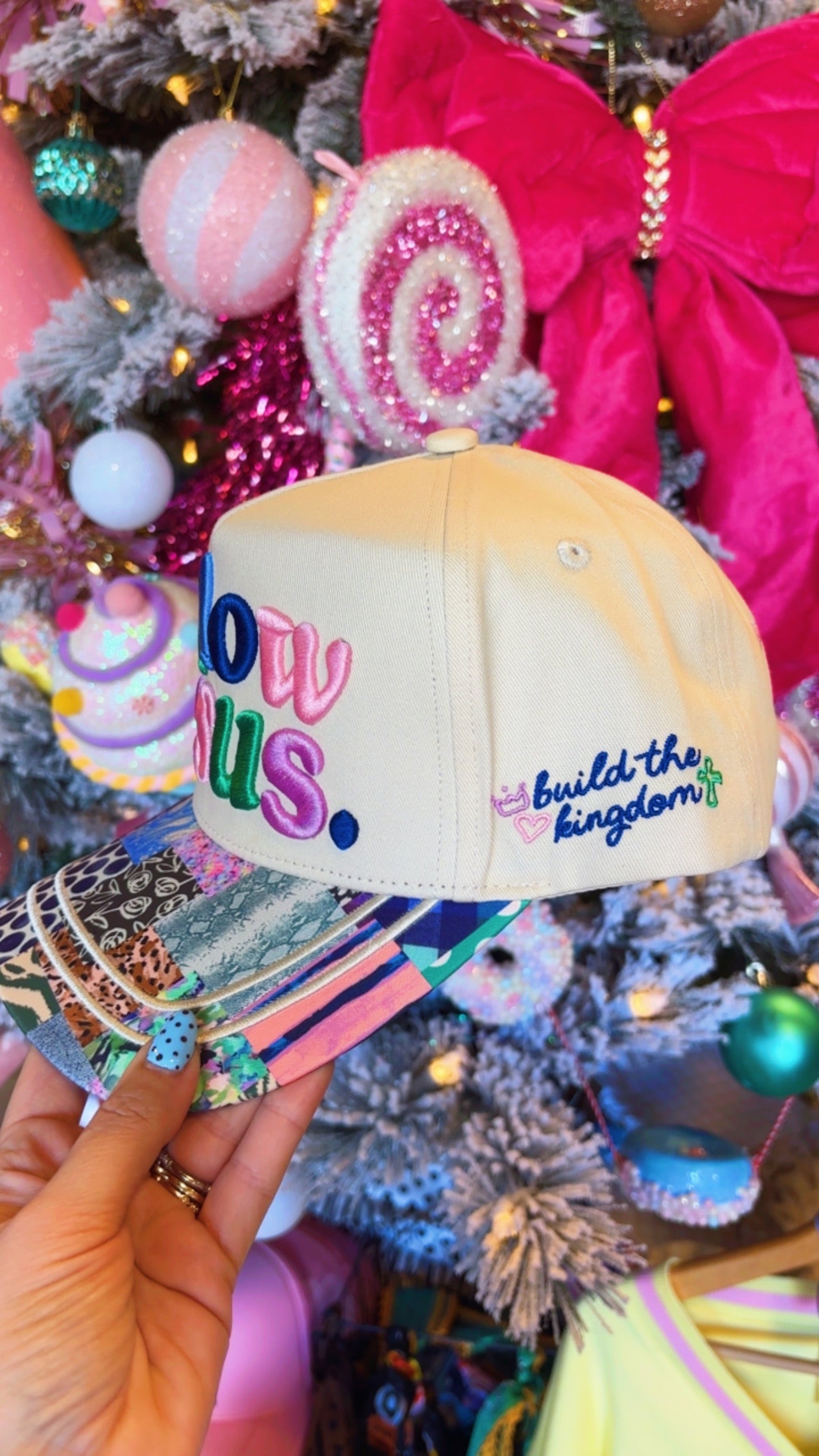 Follow Jesus patchwork trucker hat, all bills are slightly different. With embroidery detail on side and back of hat as pictured.