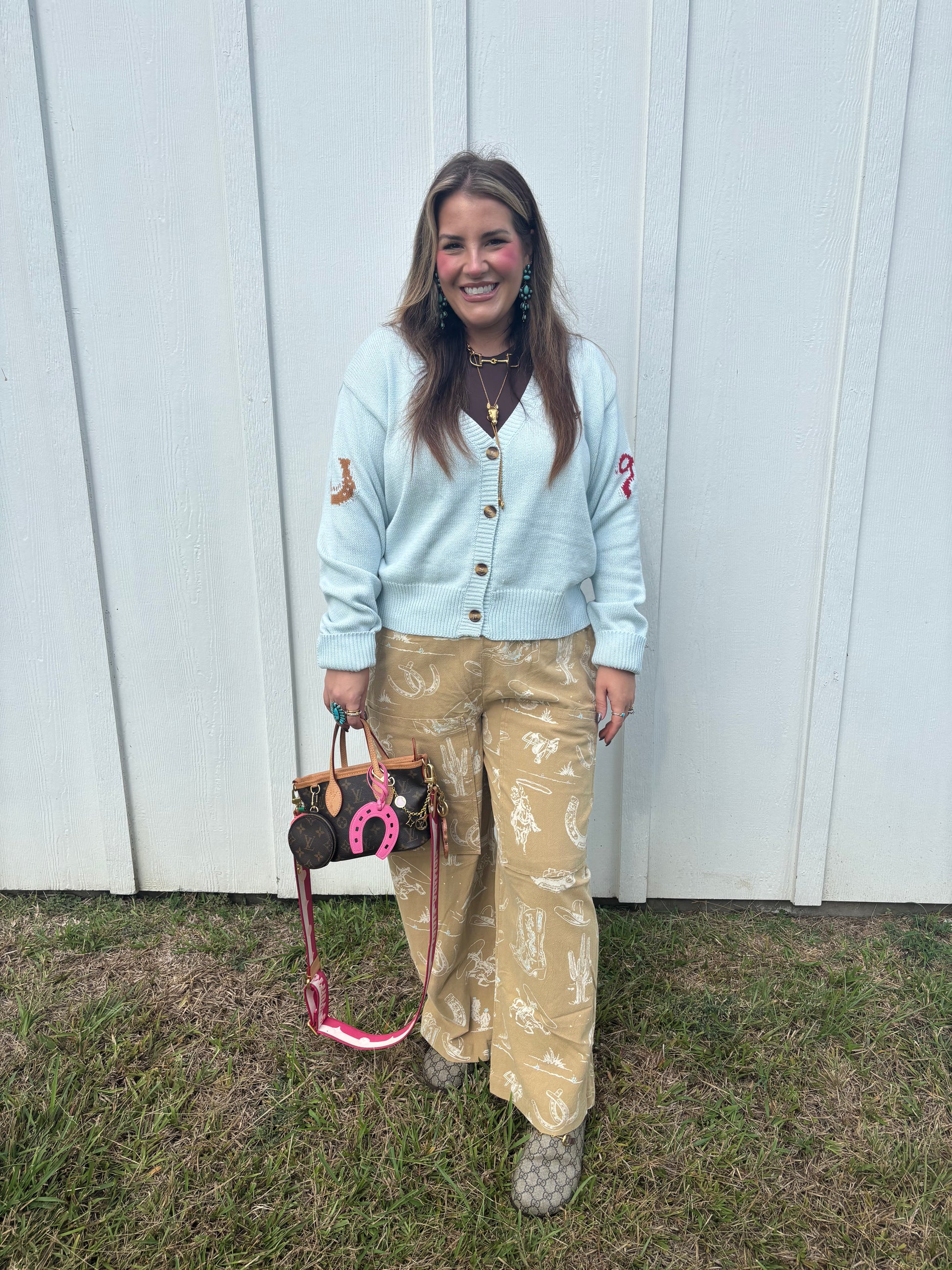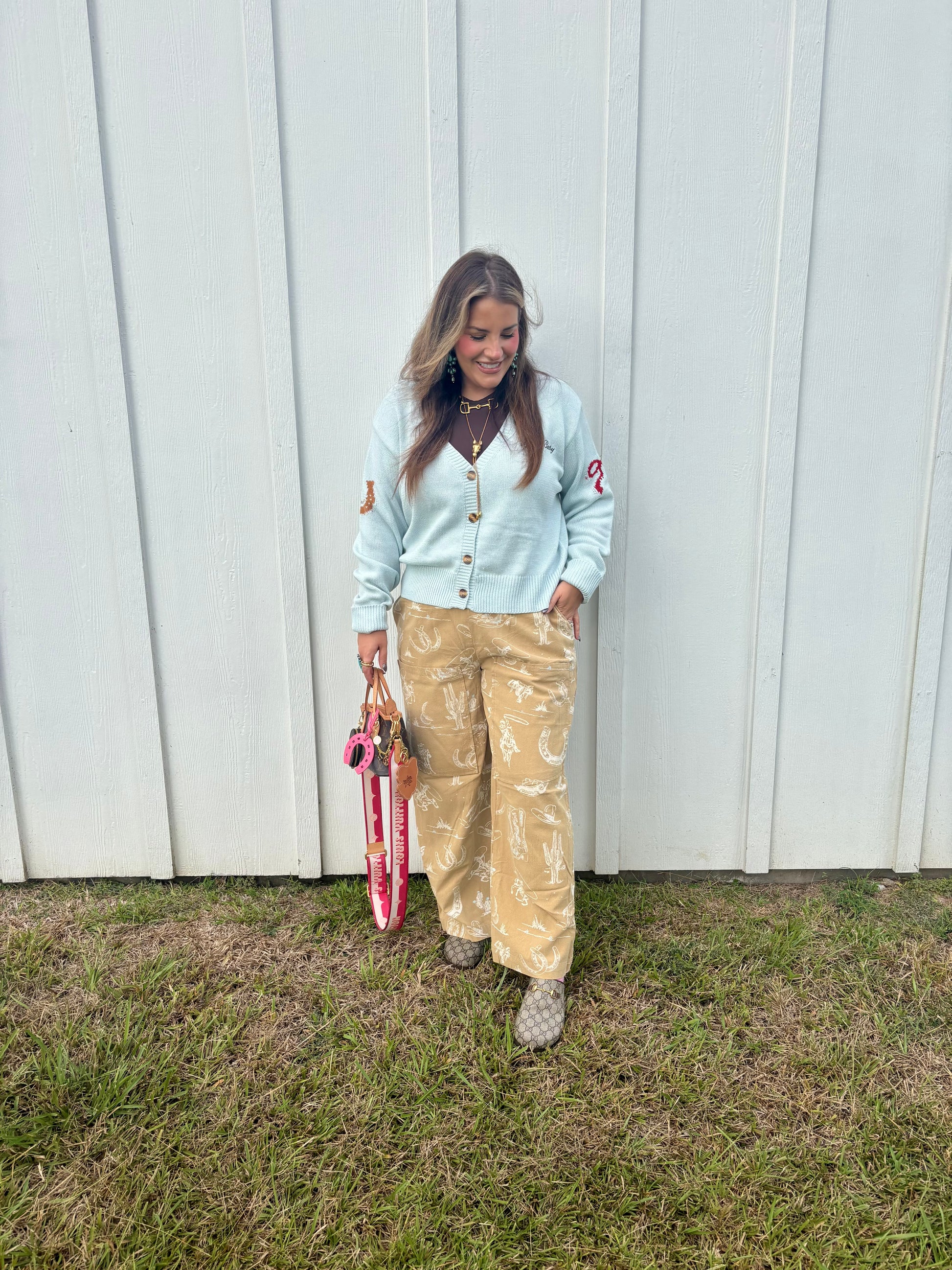Western print pants, so comfy and cute! Ashton is wearing a medium for a comfy fit but can also wear the medium. These are a FP dupe and such a vibe! Pair with a fun trucker, graphic or cardi like pictured here for a cutie fall fit!