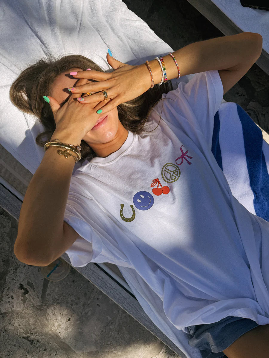 This cutie has a front graphic with our favorite icons (Etta & East original design too) and the back graphic with the colorful saying is the cherry on top! We are obsessed so cute styled with boxer shorts or wear it oversized with your fav biker shorts! Comfort colors unisex style tee.