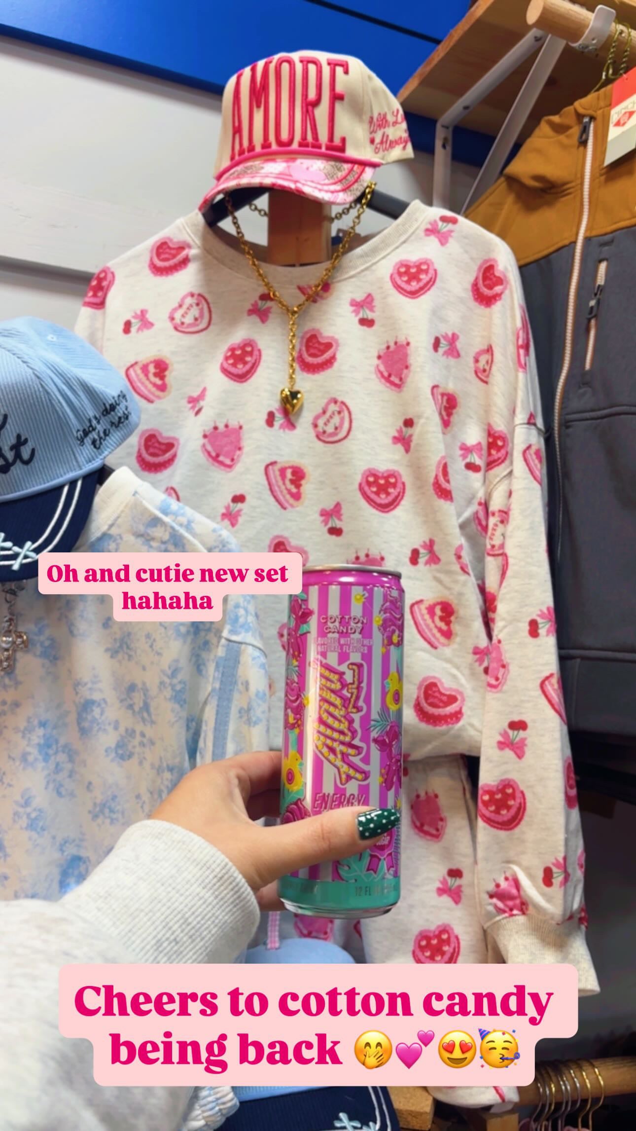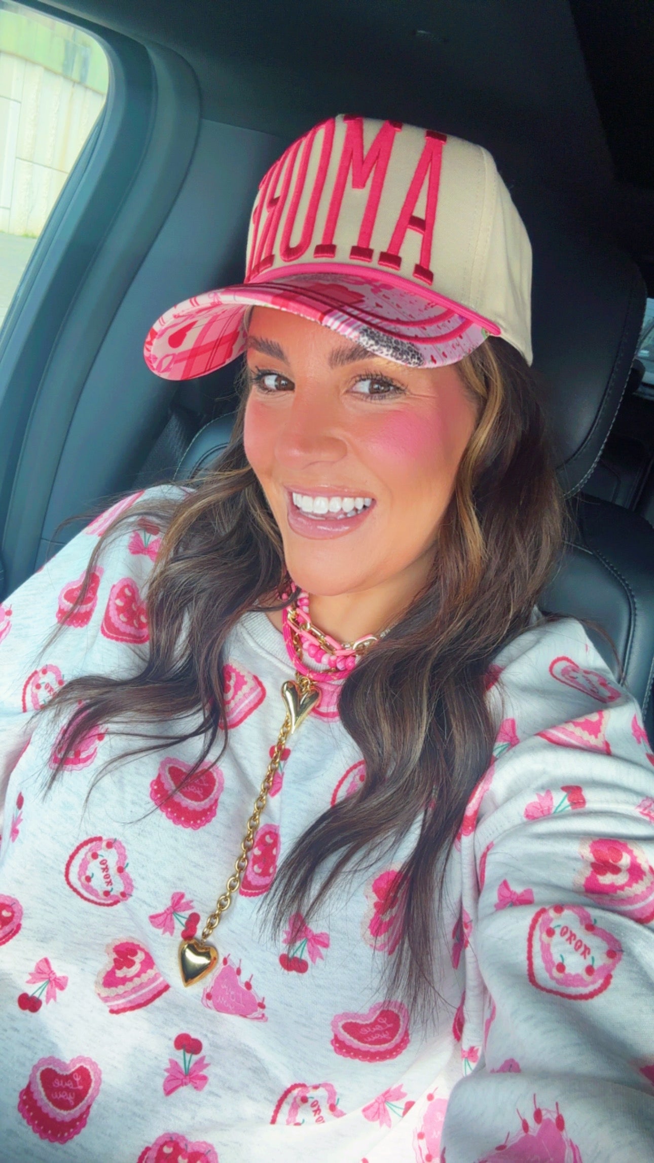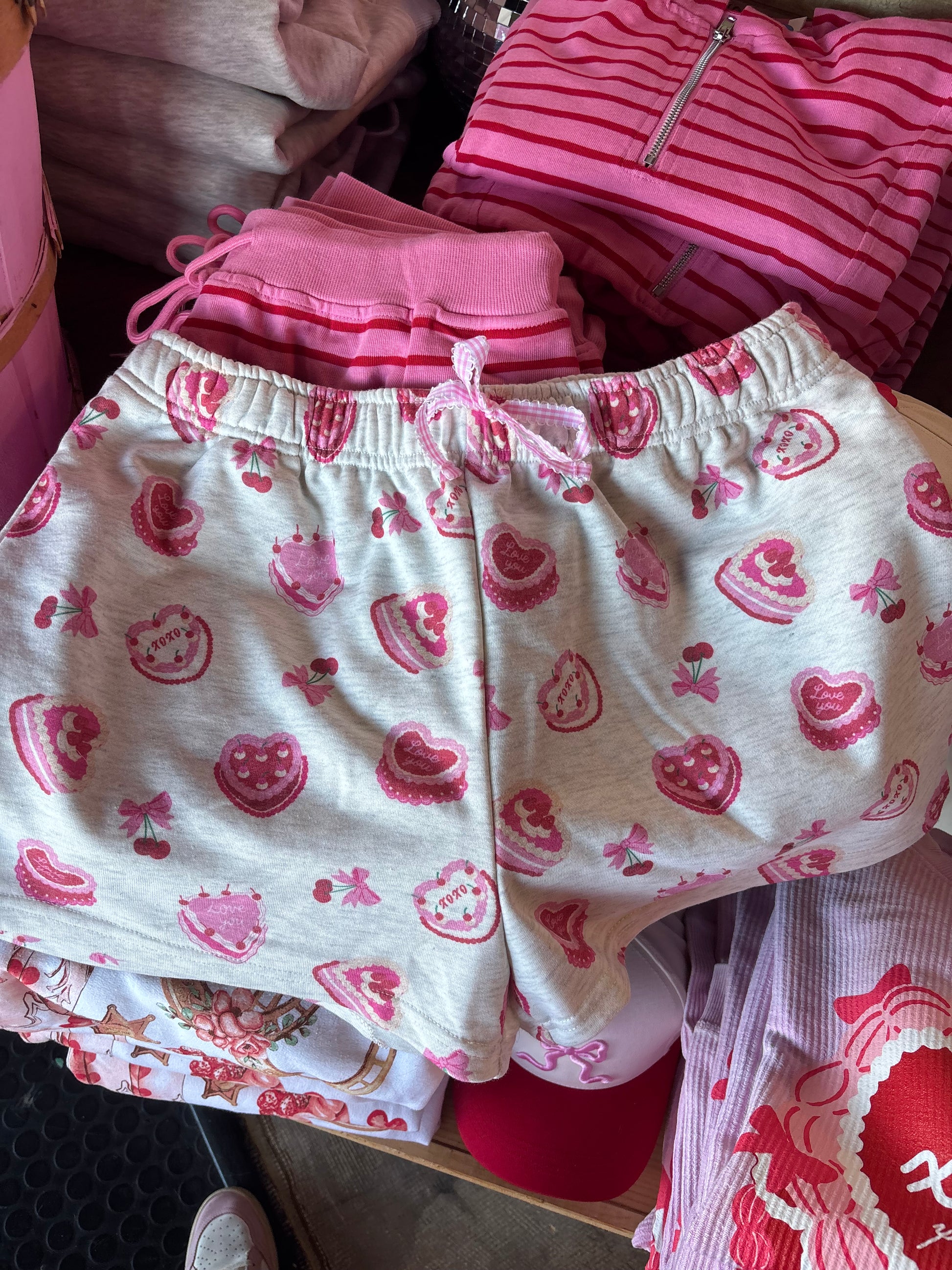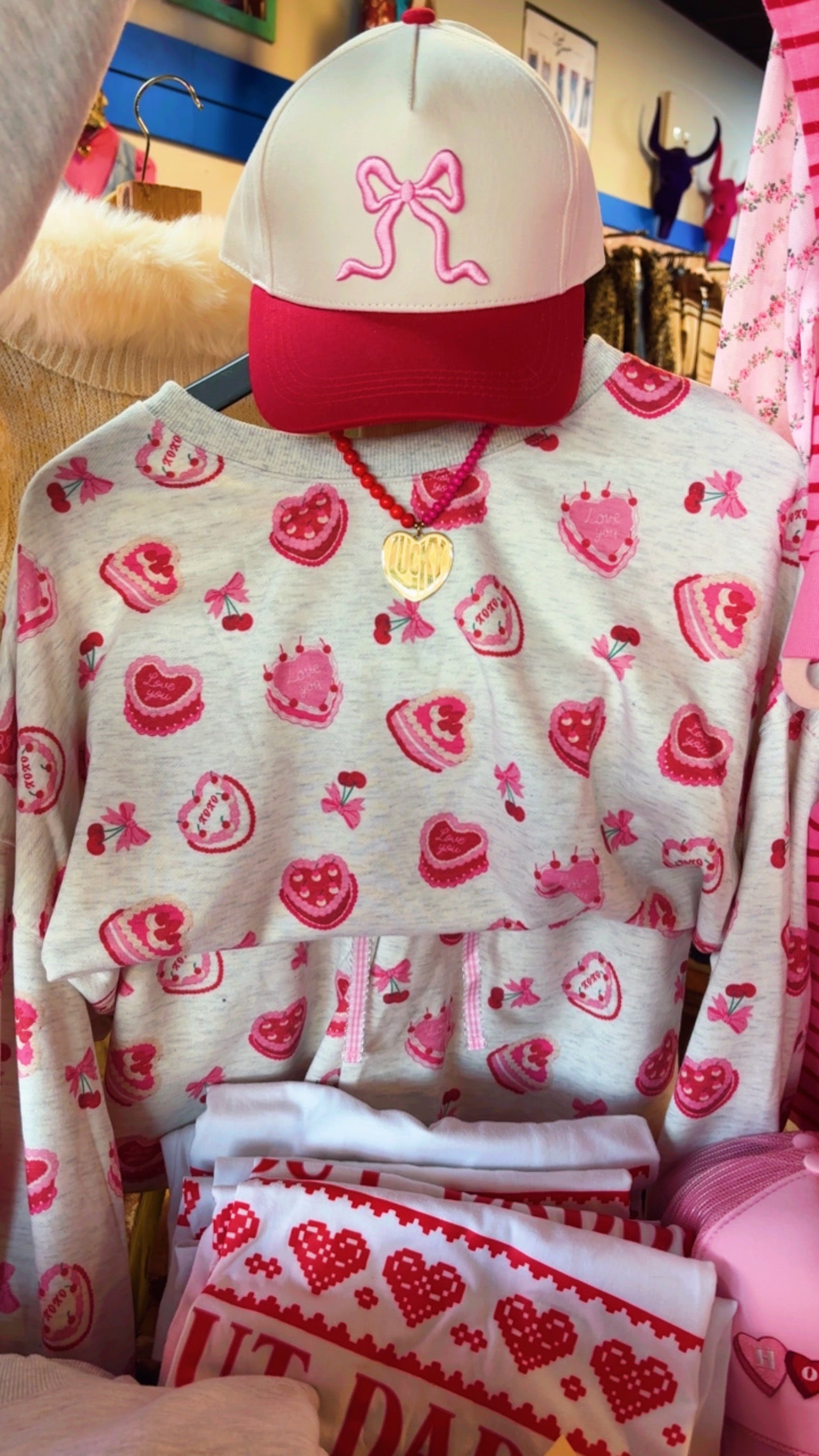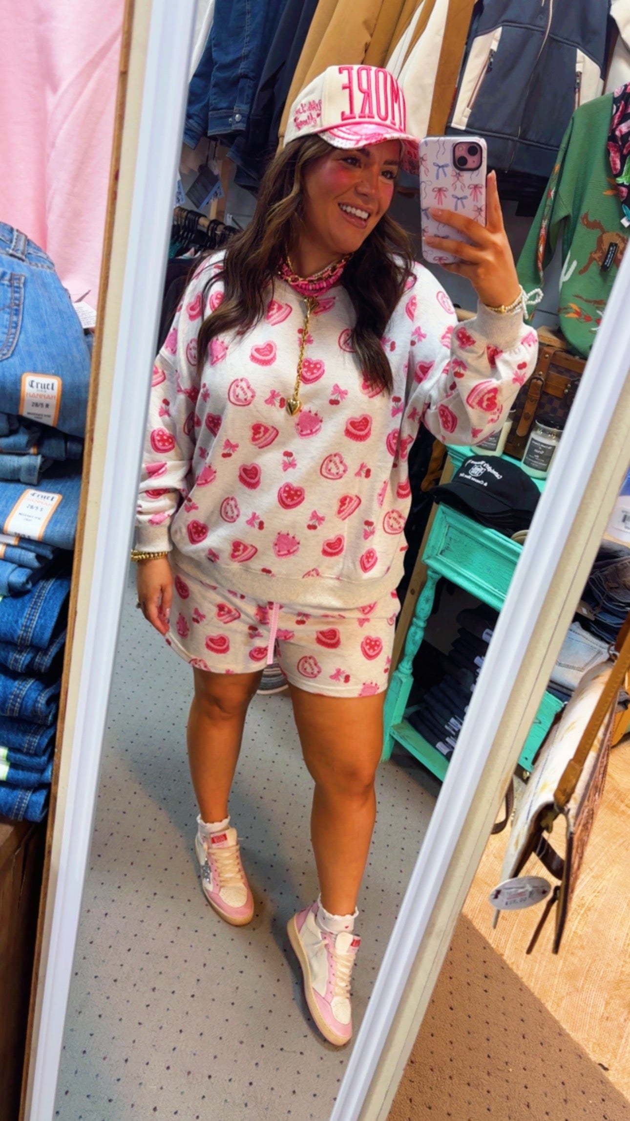 XOXO Cake Valentines Set, the cutest Valentines girly set ever!!! Or if your bday is in Jan or Feb, you need!!!! I’M OBSESSED! Ashton is a size 8 and wore the medium, it is definitely an oversized fit! Oversized sweatshirt and drawstring stretchy shorts with pockets and the most iconic print ever!!!!! Cherries, cakes, XOXO, all the cutie valentines icons!
